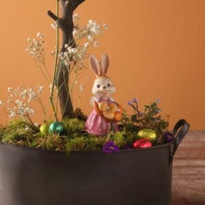 Paashaasje in lila jurk en gele voorjaarsbloem